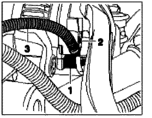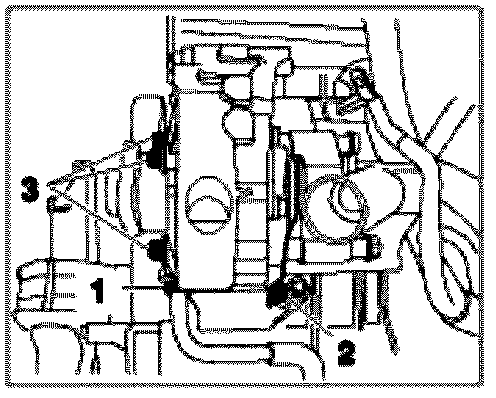 8. Loosen support for servo lines -2- by unclipping the oxygen sensor from the support -3- and unscrewing the two Torx screws (M6 x 12) -1 -. Replace screws during installation.