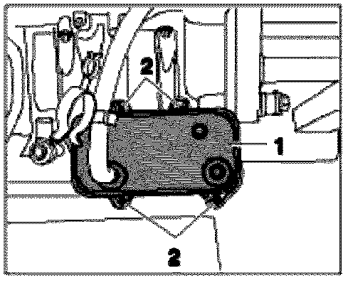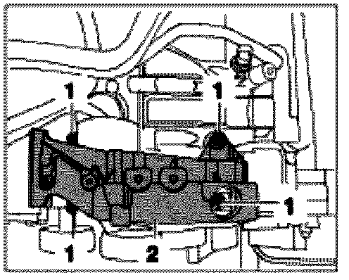 18. Remove power-steering pump support -2- by unscrewing the four Torx screws (M8 x 35) -1-. The power-steering pump support -2- is additionally fixed with roll pins; if necessary use a rubber hammer for the removal.