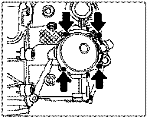 11. Remove the cover for drive belt by unscrewing the three Torx screws (M6 x 12) -arrows-. Replace screws during installation.