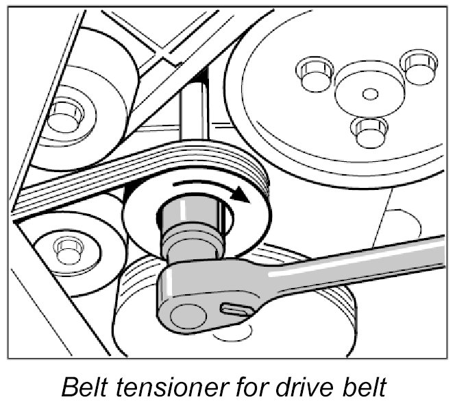 12. Turn the tensioning roller clockwise using a ring wrench (a/f 24), position the drive belt and then tension it.