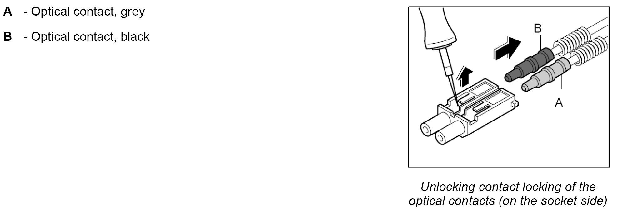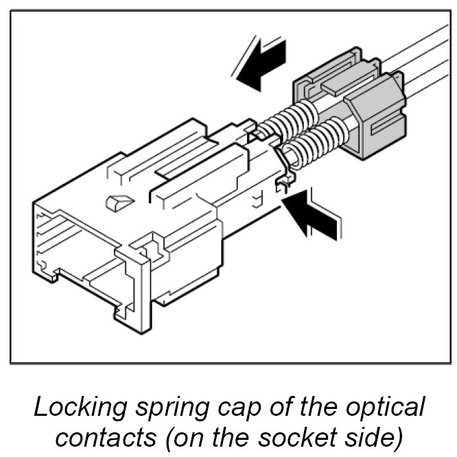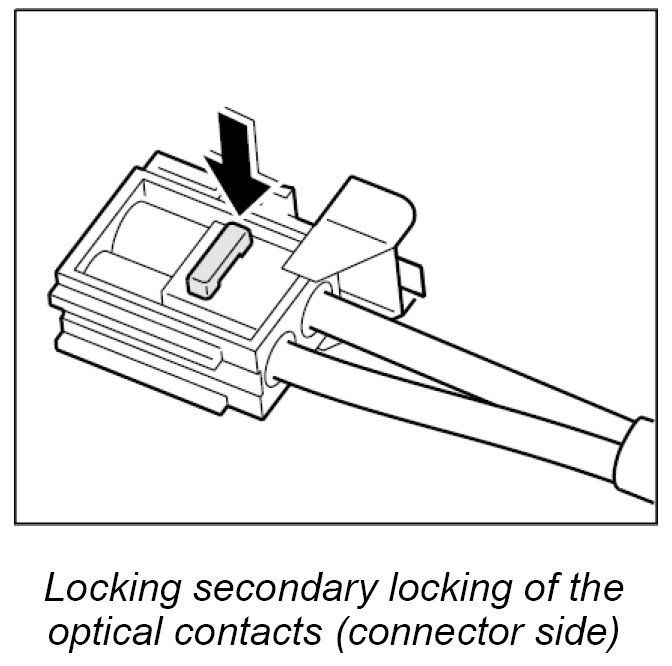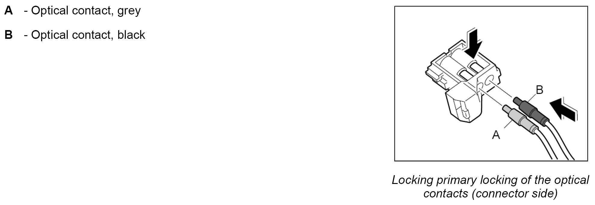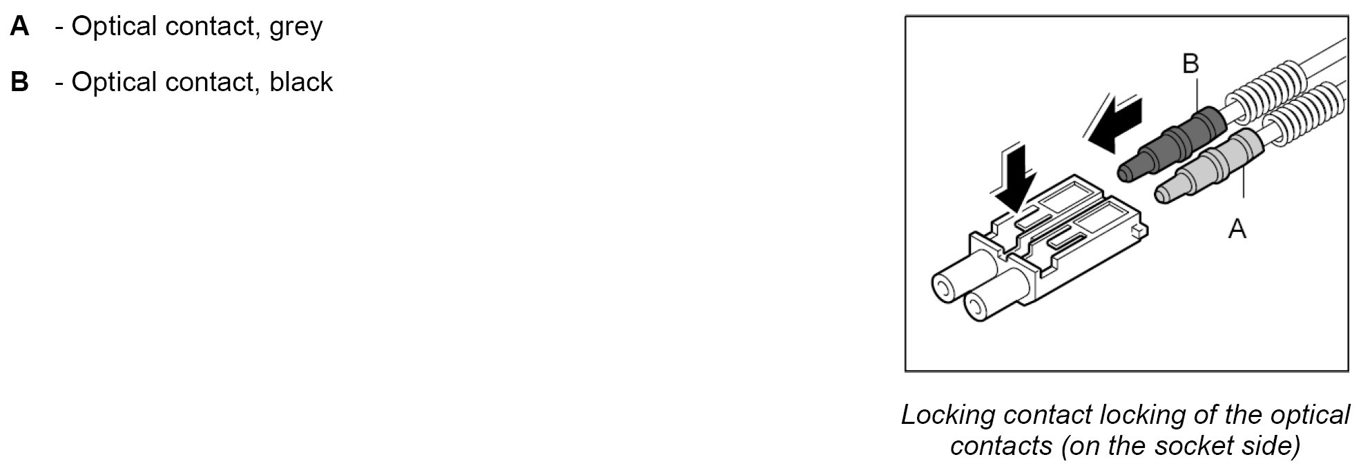 The LWL is delivered with affixed plastic contacts. These contacts are latched in the connector housing in the case of repairs. Grey and black contacts with identical mechanical dimensions are used.