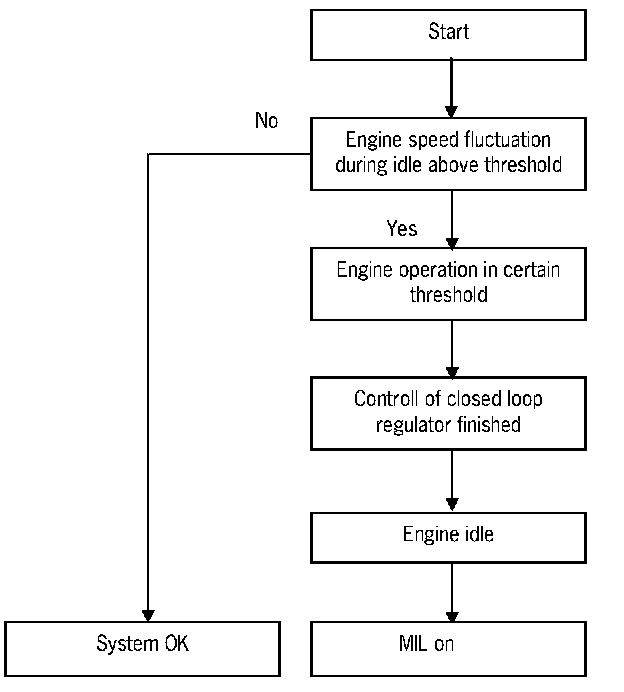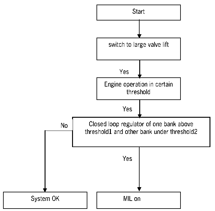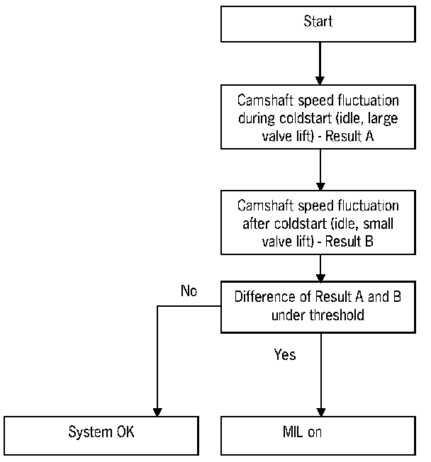 The monitor runs after coldstart with large valve lift during engine idle and vehicle speed at zero. A second phase of engine idle and vehicle speed at zero is needed after coldstart. In both phases the position of the camshaft has to be static.