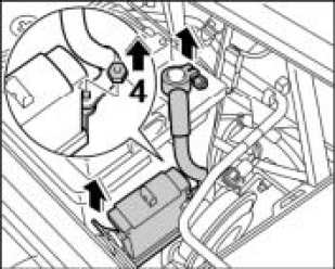 4. Remove battery disconnect switch together with the lead for the negative terminal and unscrew the fastening nut -4-. Remove lead for the negative terminal.