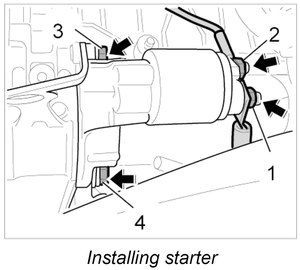 3. Position electrical leads on the starter and tighten with fastening nuts -1, 2- . - Tightening torque: 13 ftlb. - Tightening torque: 5 ftlb.