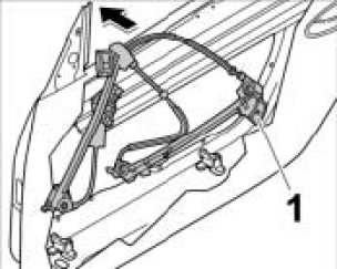 4. Fold power windows -1- together and remove through the door opening -arrow-.