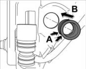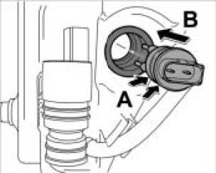 2. Apply a suitable rubber lubricant (tyre mounting paste) to the sealing surface -arrows A- and press the sensor for fluid level display into the rubber seal -arrow B- until the sensor is felt to engage.