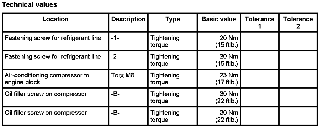 9. Screw in rear Torx screw for air-conditioning compressor (M8 x 120) -1- and tighten all three screws for air-conditioning compressor. - Tightening torque: 23 Nm (17 ft. lbs.).