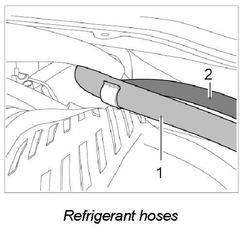 6. Clip in refrigerant hoses -1- and -2- between body and intake-air distributor.