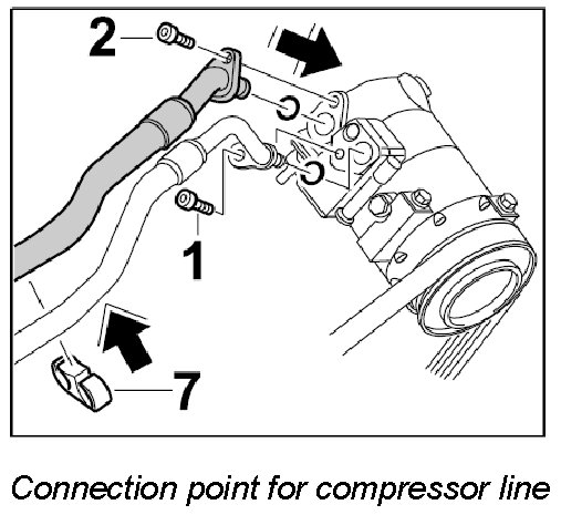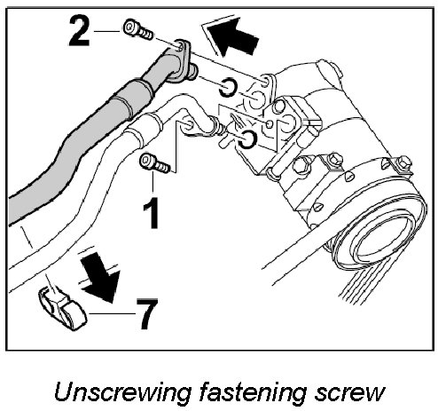3. Unscrew the refrigerant line between the compressor and condenser at the connection points on the compressor and on the condenser and disconnect it.