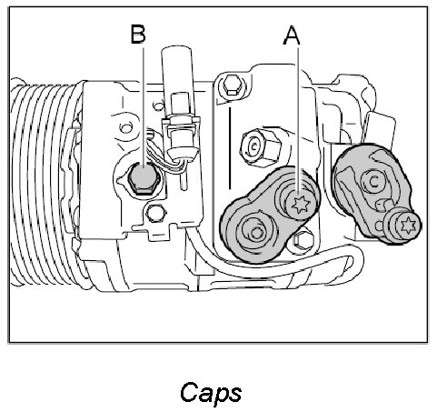 1. First, open the cap on the high-pressure side and relieve the pressure from the compressor -A-.