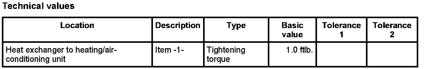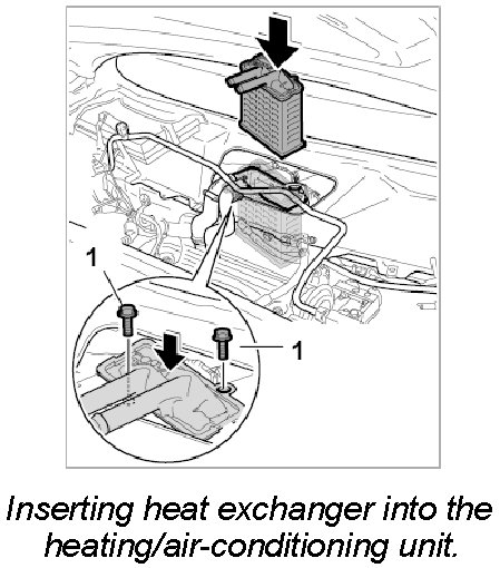 1. Carefully insert heat exchanger from above into the heating/air-conditioning unit and secure with the fastening screws -1-. - Tightening torque: 1.0 ft. lbs.