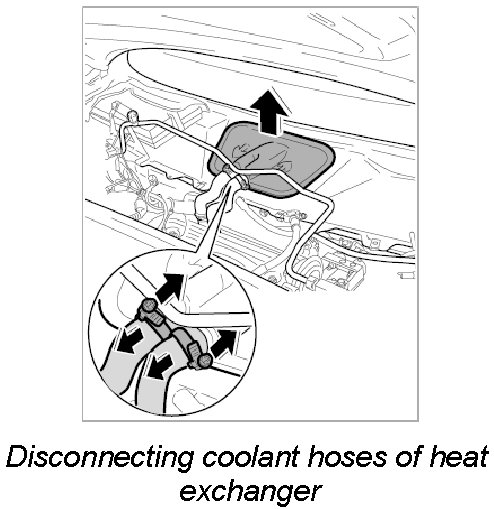 1. Release the two fastening clamps for the coolant hoses of the heat exchanger and slide them back over the hoses.