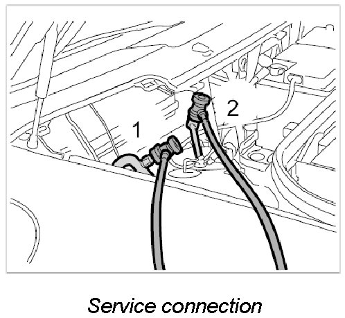 Before connecting the high-pressure -2- and low-pressure lines -1- to the vehicle, remove any refrigerant in the lines by suction.