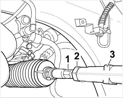 Loosen tie rod lock nut(s) -2-. When loosening and tightening the tie rod lock nut(s) counter on the square of the tie rod -3-, with an open-ended wrench. Then adjust the toe on the hexagon -1- of the tie rod(s). Then tighten the tie rod lock nut(s) -2- to the prescribed tightening torque.