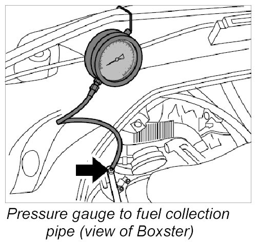 9. Read value on pressure gauge. Fuel pressure - engine not running: 3.8 bar+/-0.2 bar