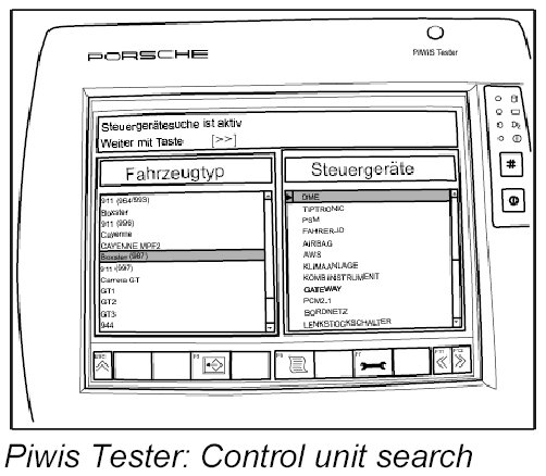7. Run the individual control unit search for DME using the Porsche PIWIS Tester. To do this, select DME with the tracer pen and press F12 >> .