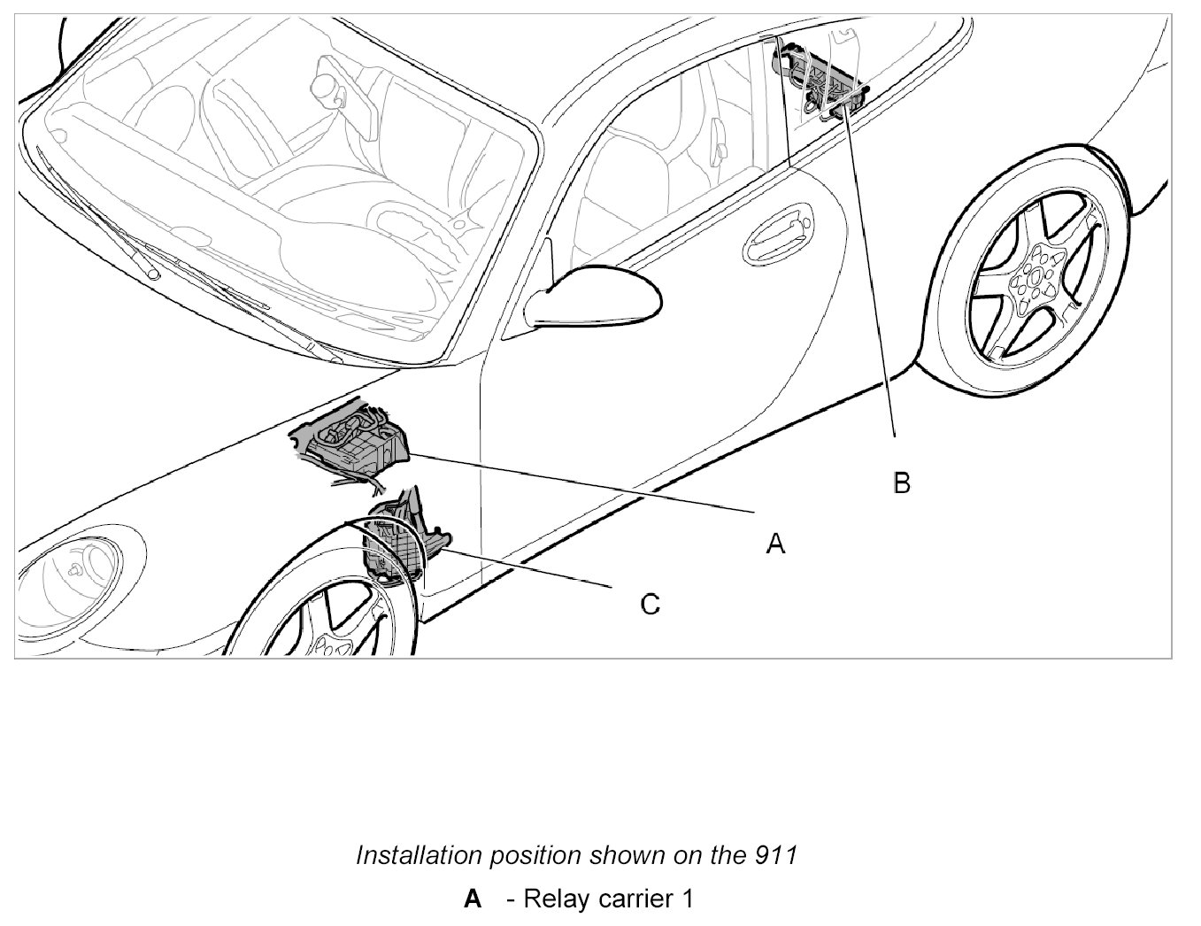 1. -A- Pull apart both retaining lugs on relay carrier support and press the relay carrier upward.