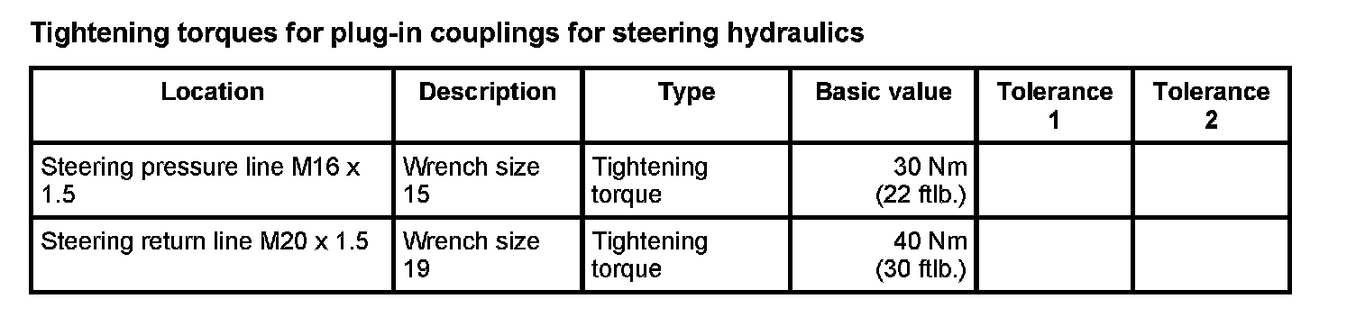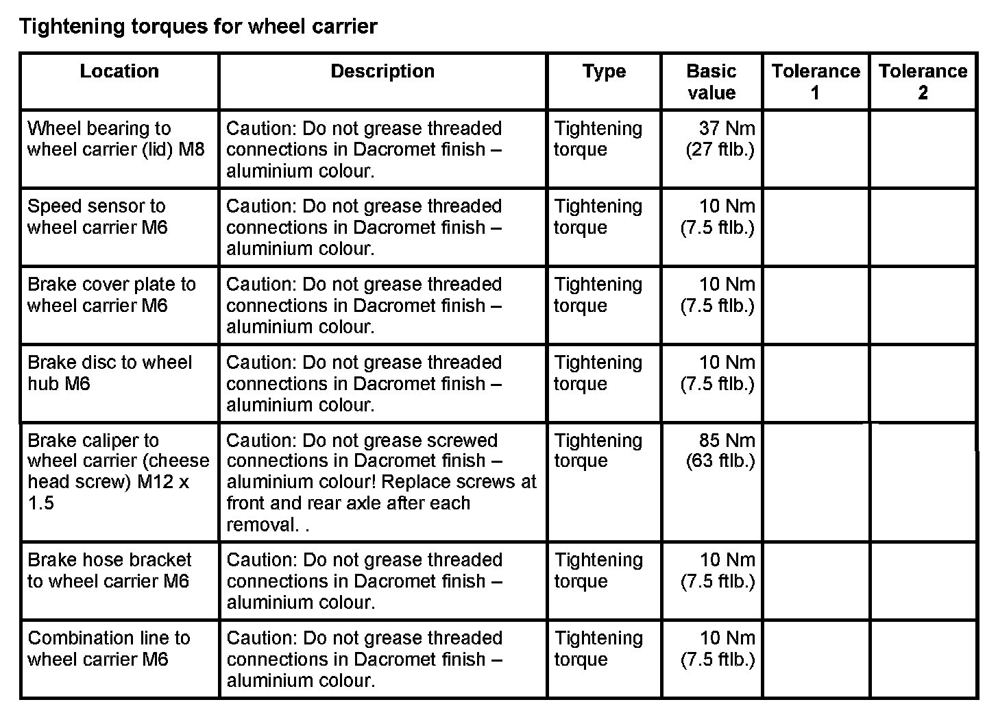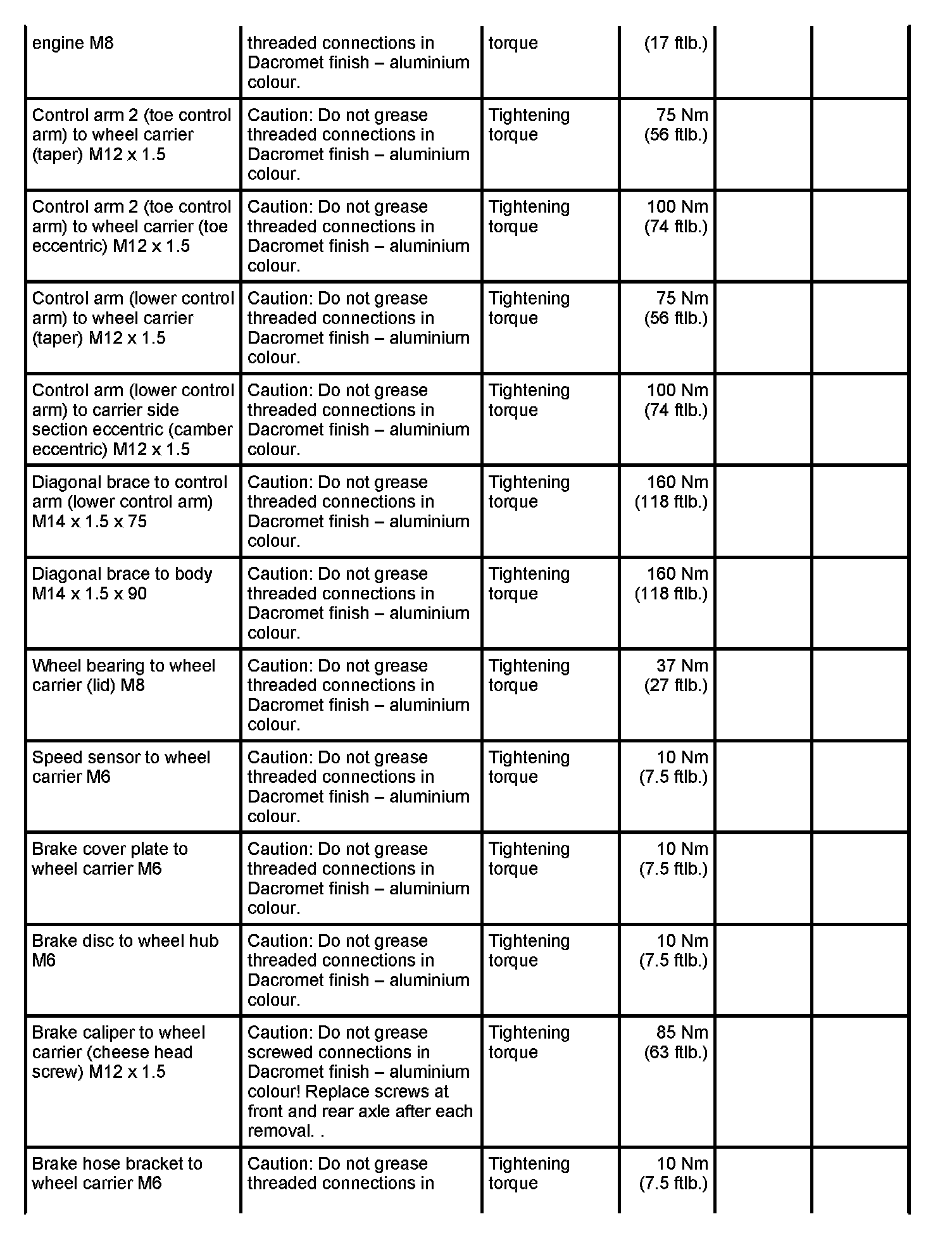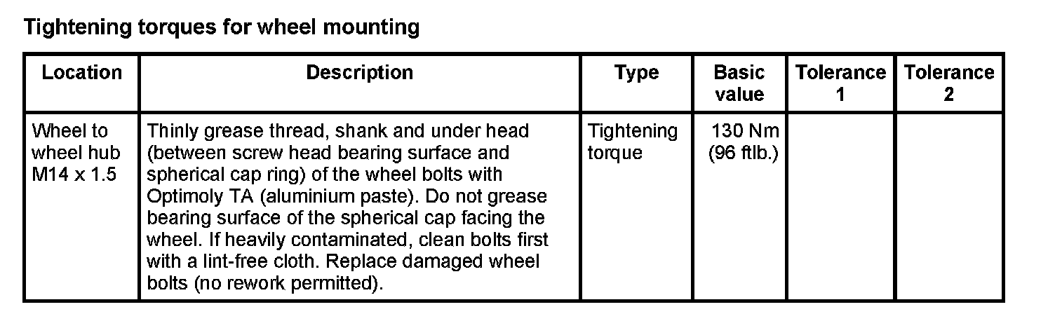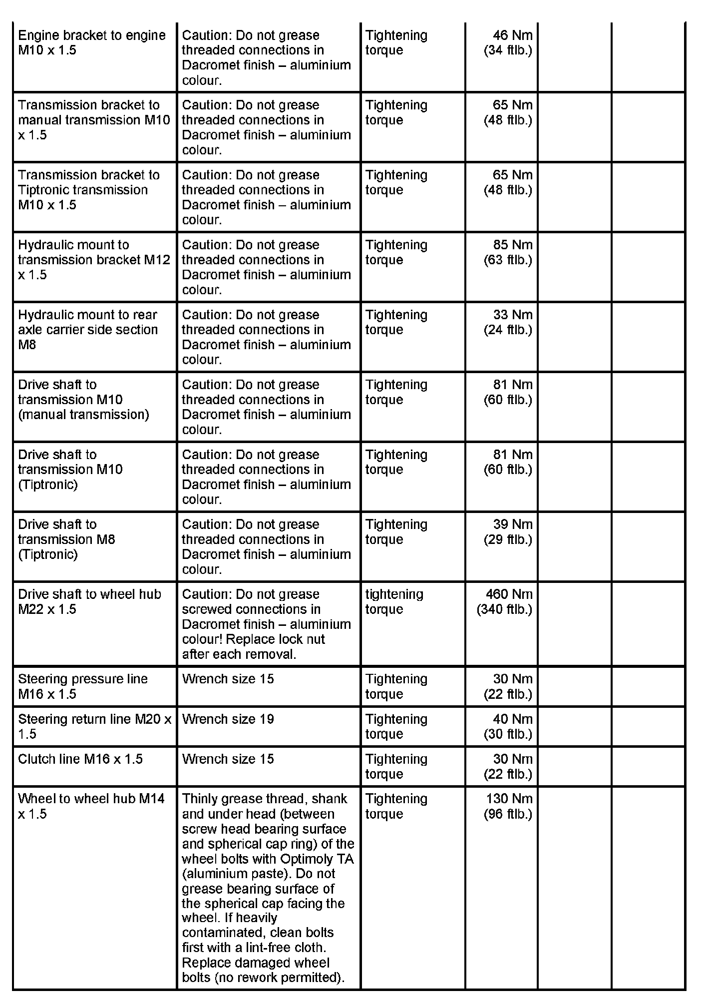 WM 420000 Tightening torques for rear axle