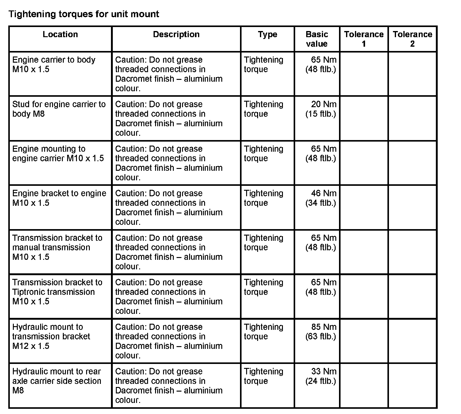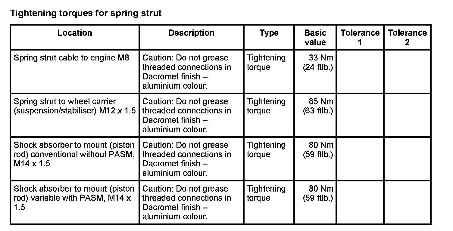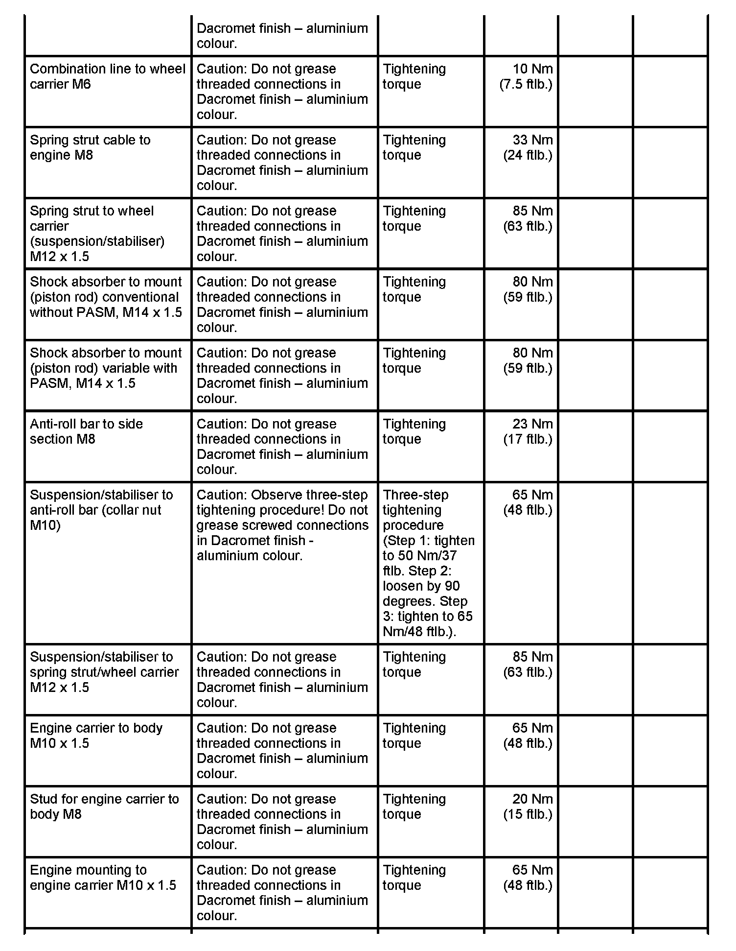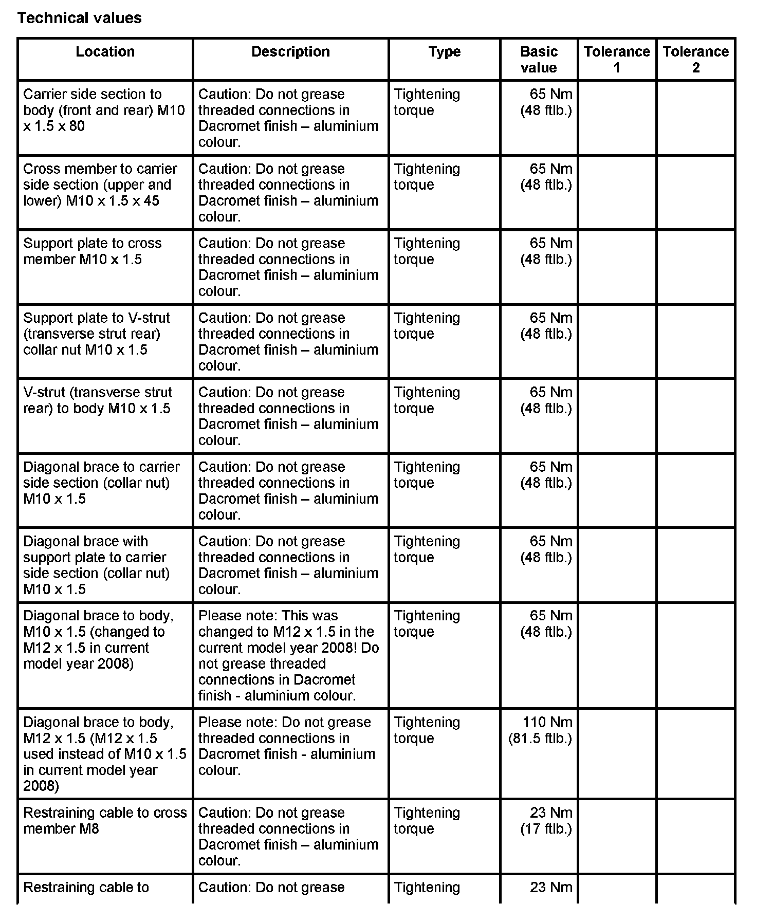 WM 420000 Tightening torques for rear axle