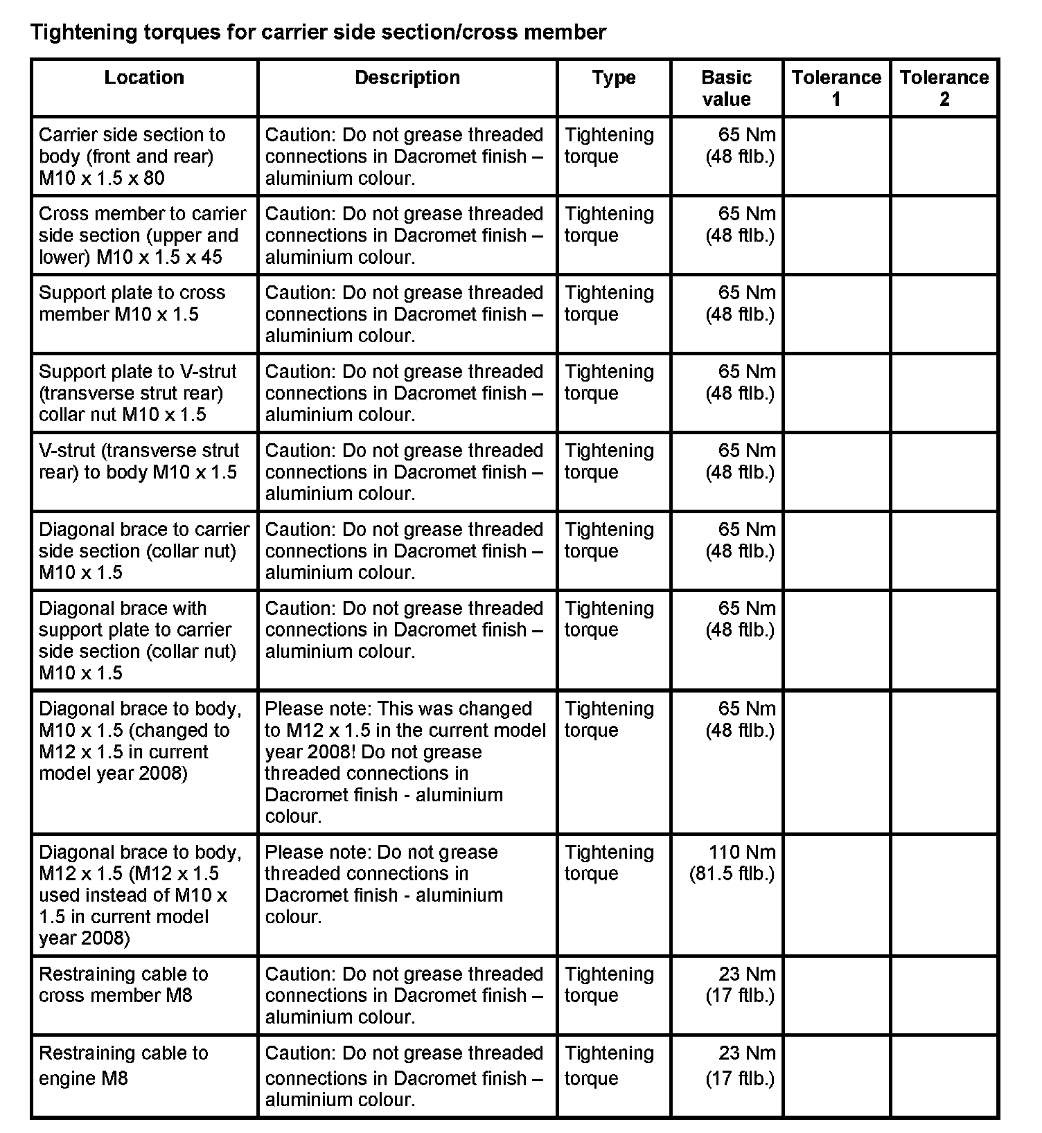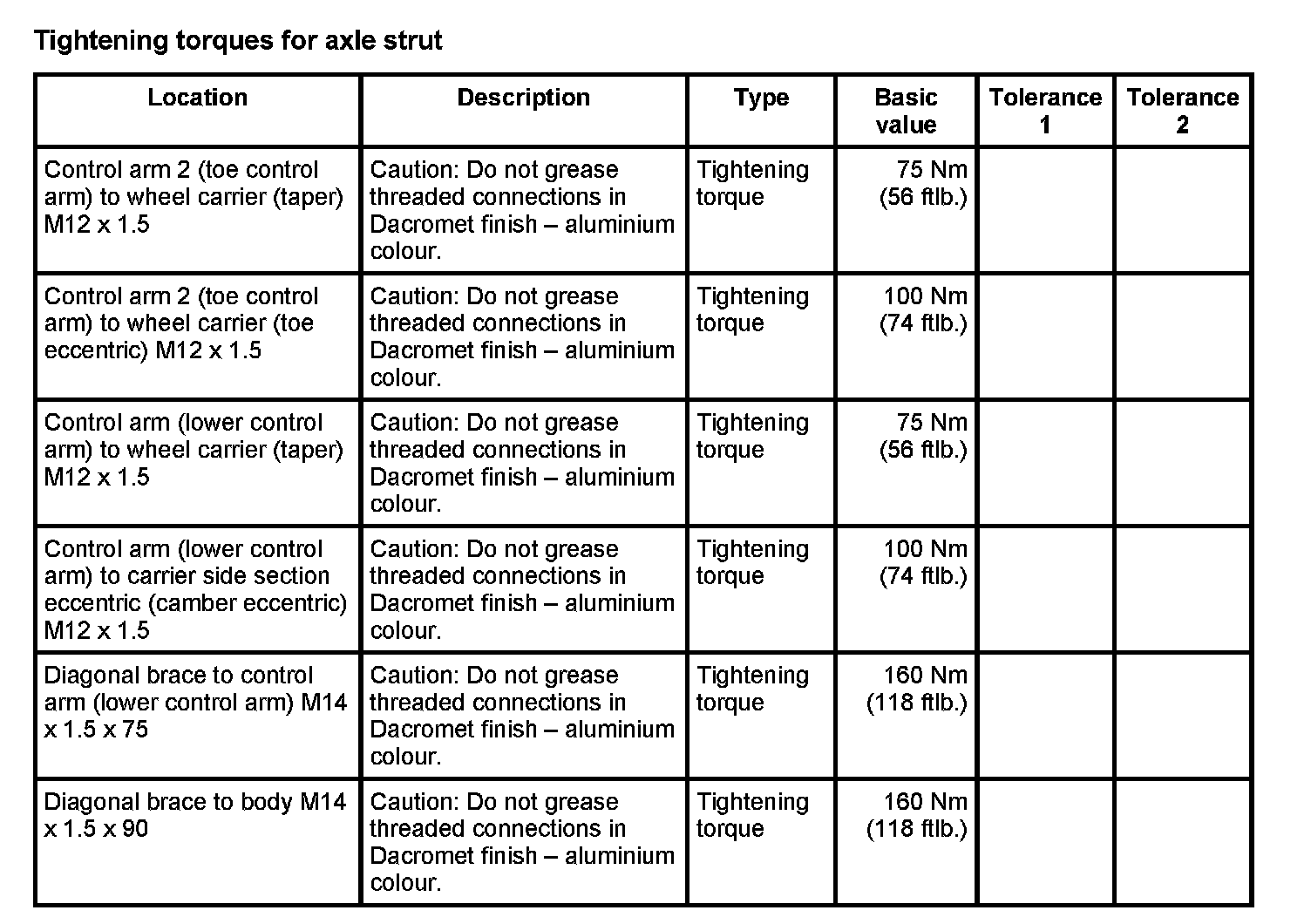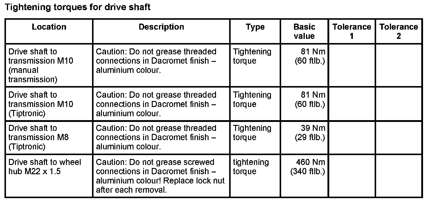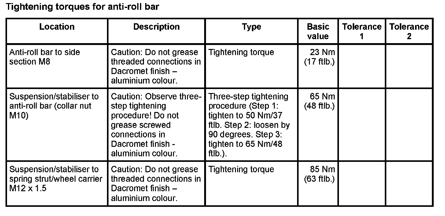 Tightening torques for rear axle