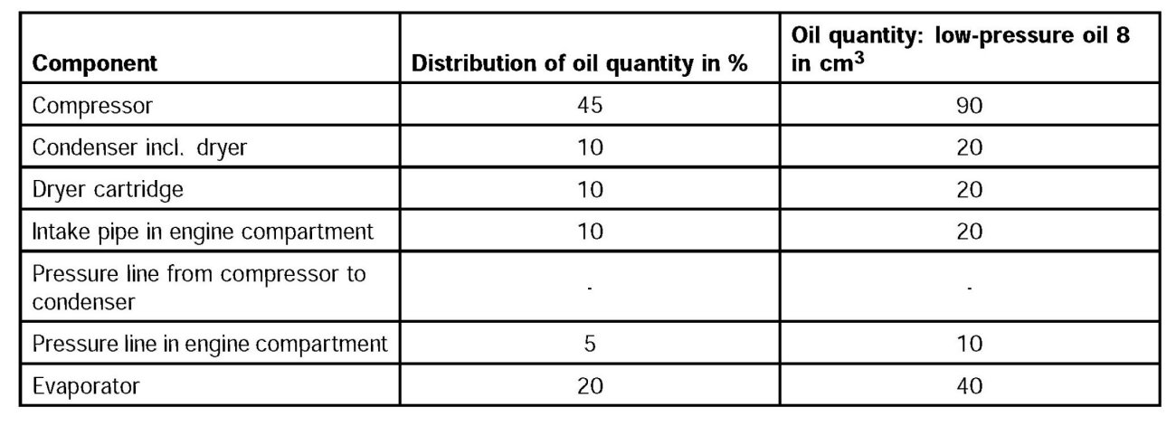 - After the refrigerant has been removed by suction and a component has been replaced, the oil quantity must be determined and topped up by the quantity remaining in the removed component.