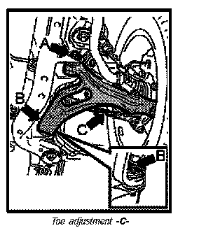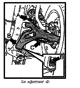 The toe is adjusted at the tie rod threaded joint for the tie rod/tie rod ball (ball joint) -C-.