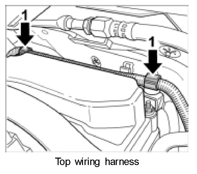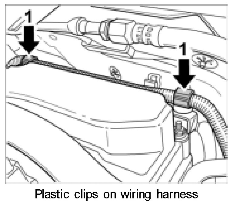 4. Insert top wiring harness into the two plastic clips -1- and close clips.