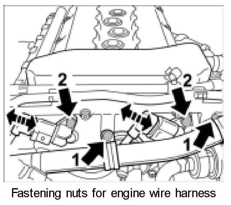3. Unscrew the two fastening nuts for the engine wire harness on the top chain case lid -1- and push the engine wire harness to the plenum panel.