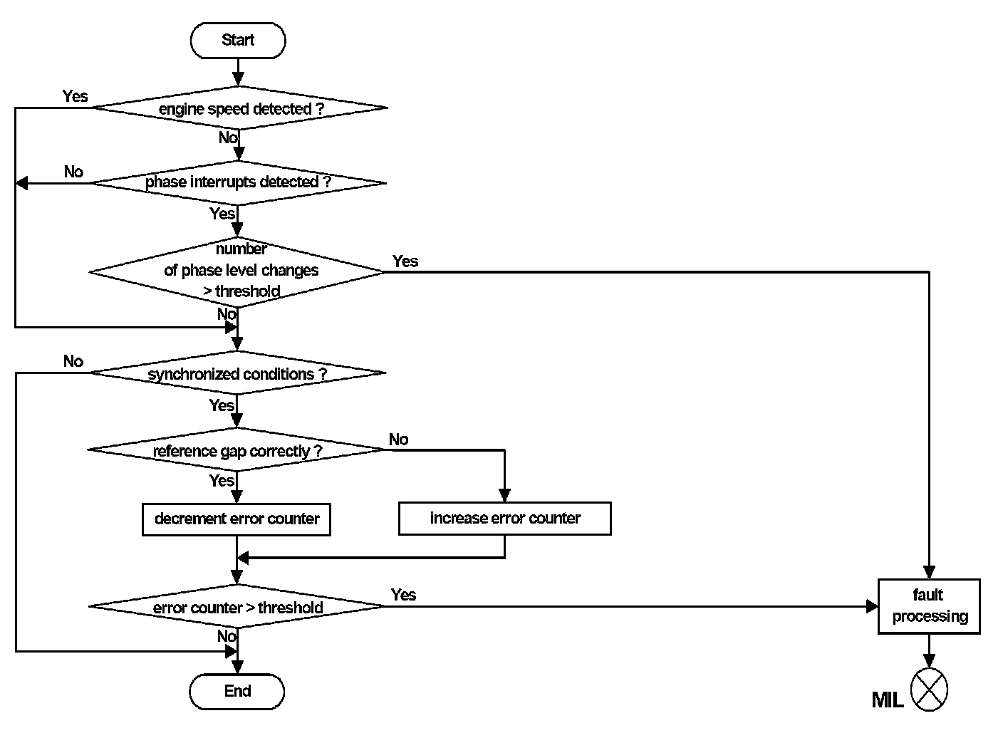 Under normal operating conditions, the flywheel position reference gap is monitored. At a loss of synchronization (more than one tooth difference between expected and observed gap position), the error counter is increased. If the gap is determined correctly the error counter is decreased. As soon as the error counter reaches a certain threshold an engine speed sensor malfunction is detected.