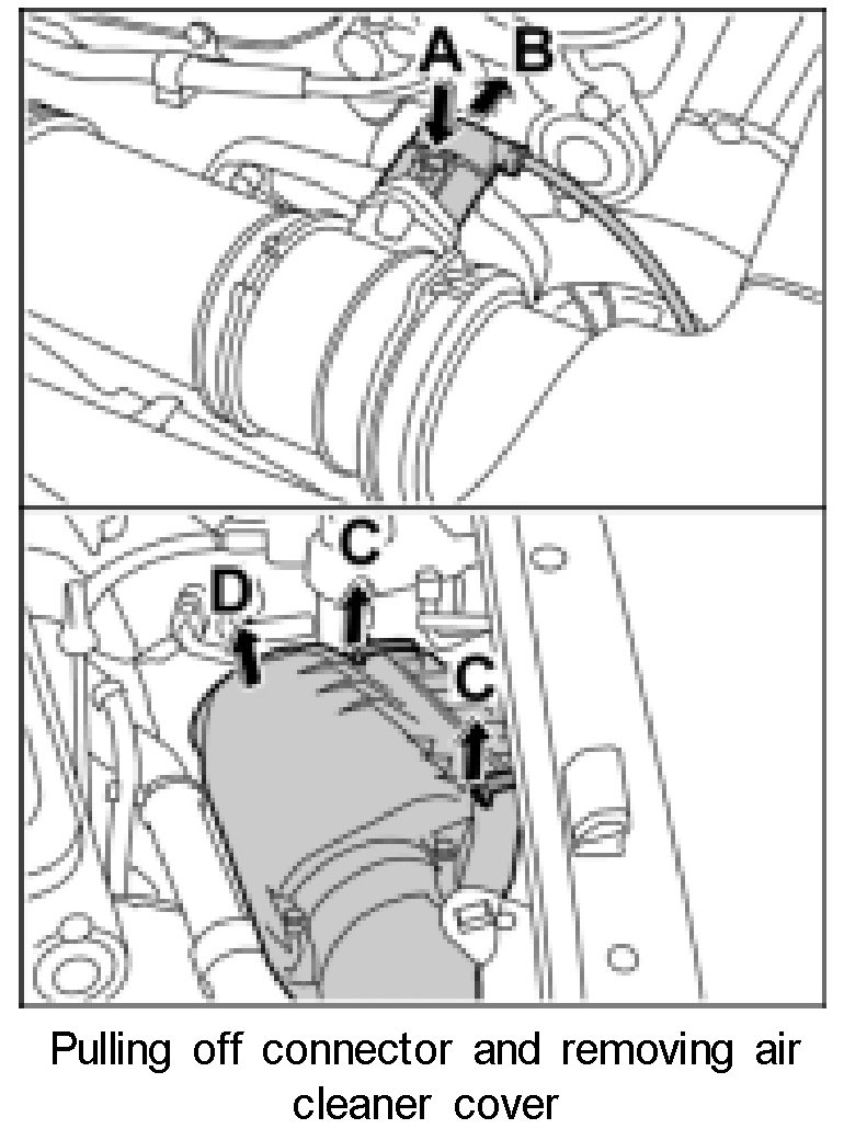 4. Release the air cleaner cover -arrows C- and lift it up and out -arrow D-.
