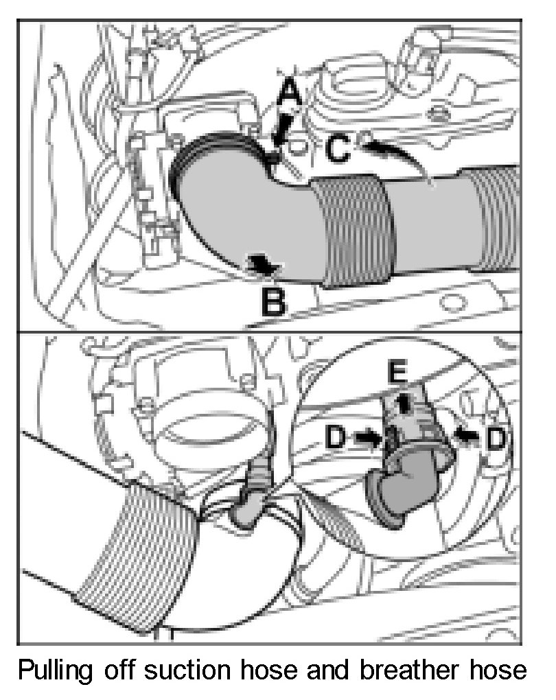 7. Release breather hose -arrows D- and pull it off -arrow E-.
