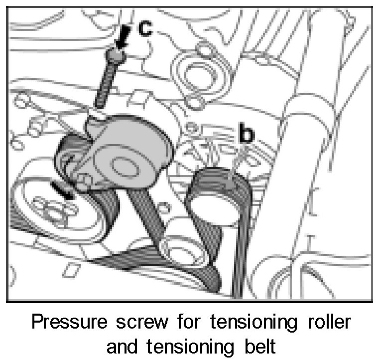 10. Unscrew the pressure screw -arrow c- and tension the drive belt -arrow-.