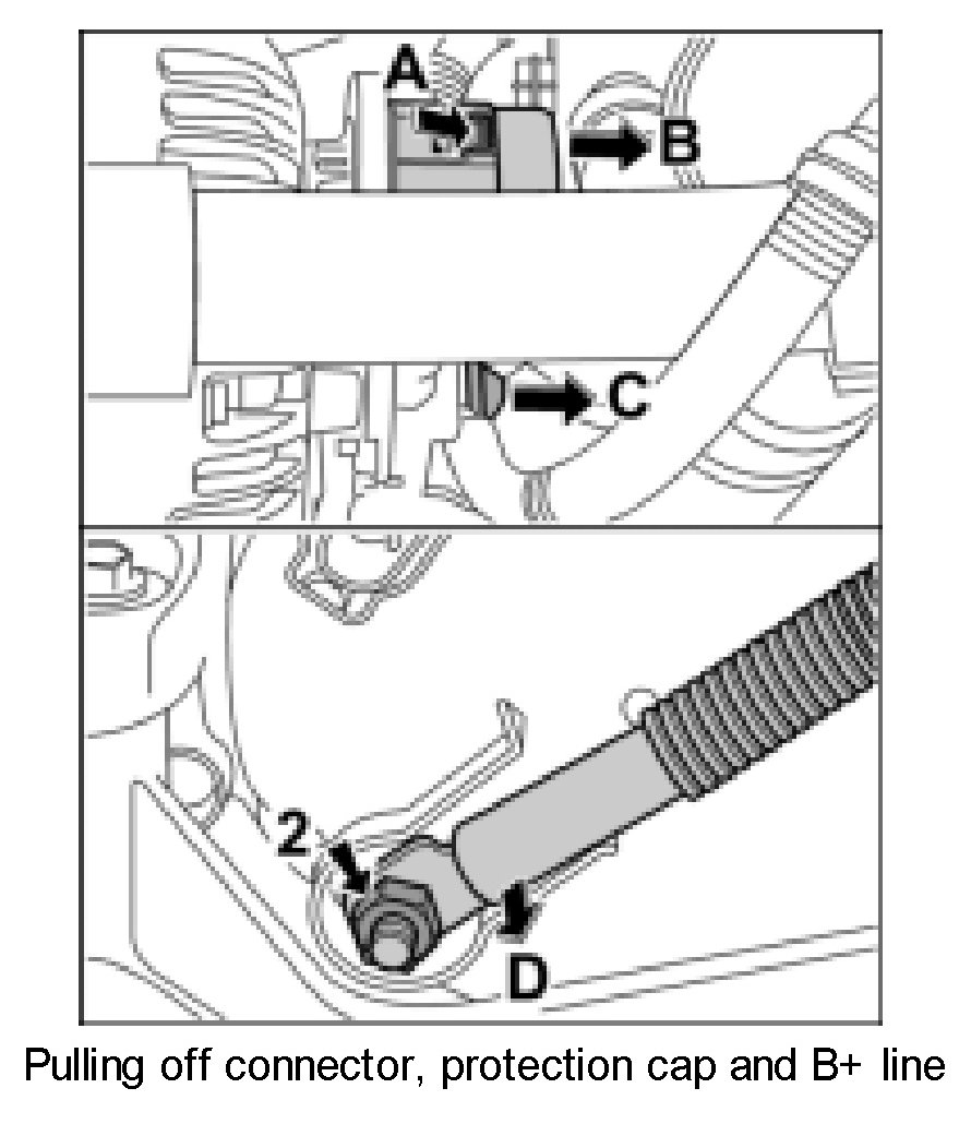 14. Unscrew fastening nut -arrow 2- and remove B+ line -arrow D-.
