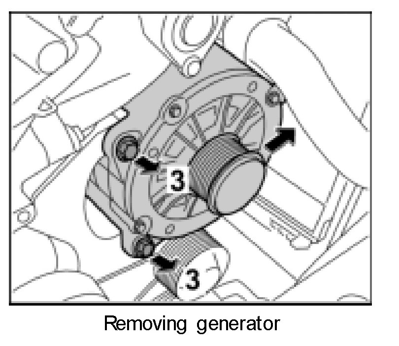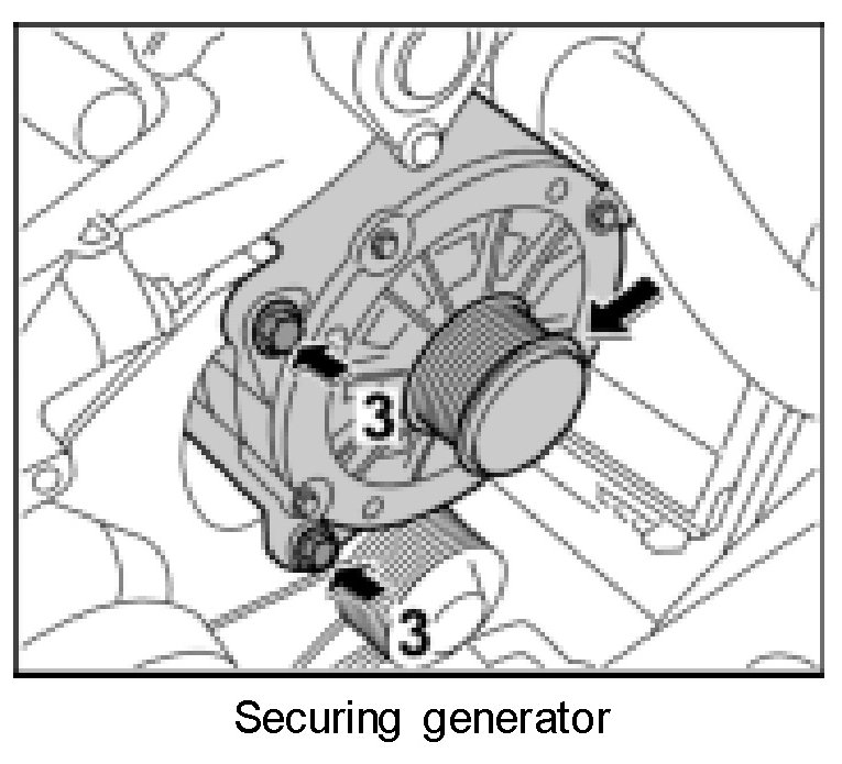 15. Unscrew fastening screws -arrows 3- and remove generator to the side -arrow-. Press generator out of the bracket using a lever if necessary.