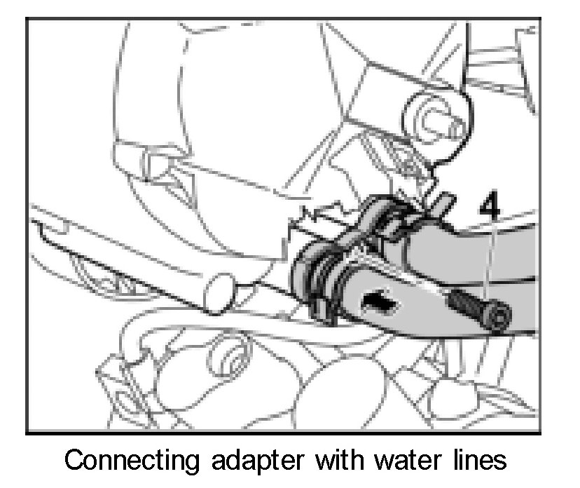 1. Attach the adapter with the water lines -arrow- and tighten with the fastening screw -4-. Tightening torque 6.5 ft.lb.