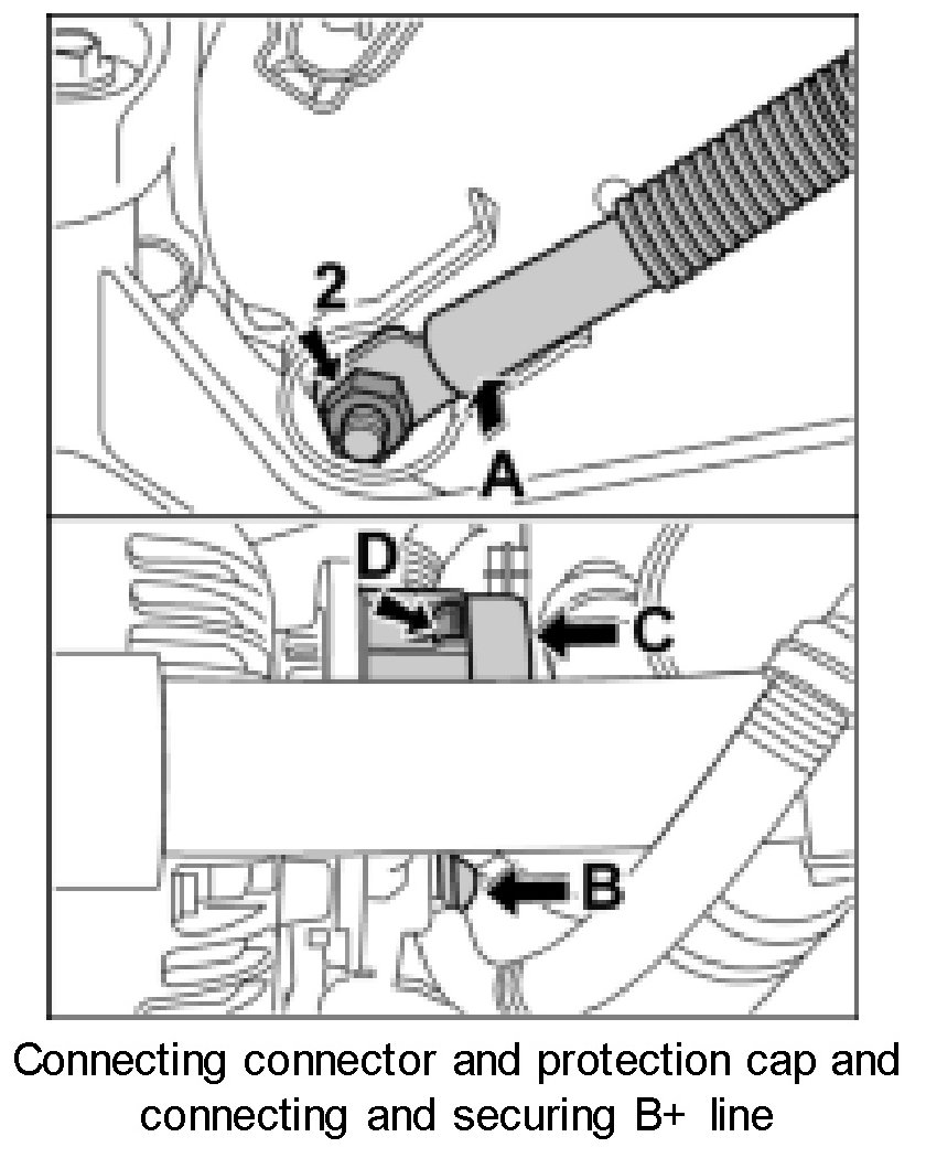 4. Connect the B + line to the generator -arrow A- and secure with the fastening nut -arrow 2-. Tightening torque 11 ft.lb.