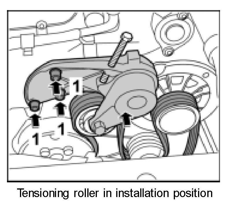 8. Secure the tensioning roller with the fastening screws -arrows 1-. Tightening torque 15 ft.lb.