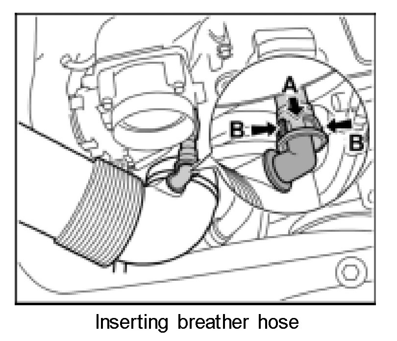 11. Insert breather hose -arrow A- until the locking tabs -arrows Bare felt to engage.