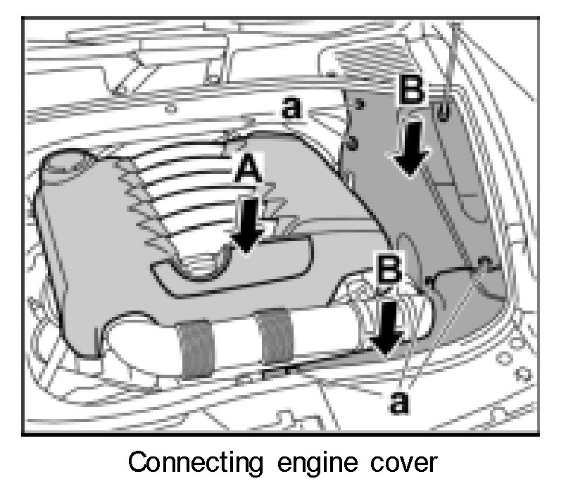 17. Fit engine cover -arrow A- until locking tabs are felt to engage.