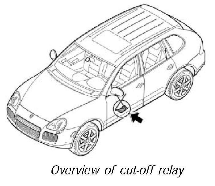 6. To activate the cut-off relay: Press on the colored area of cut-off relay (located in power distributor).