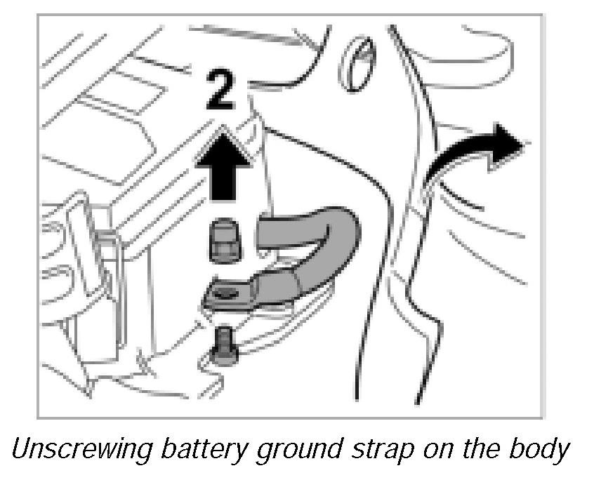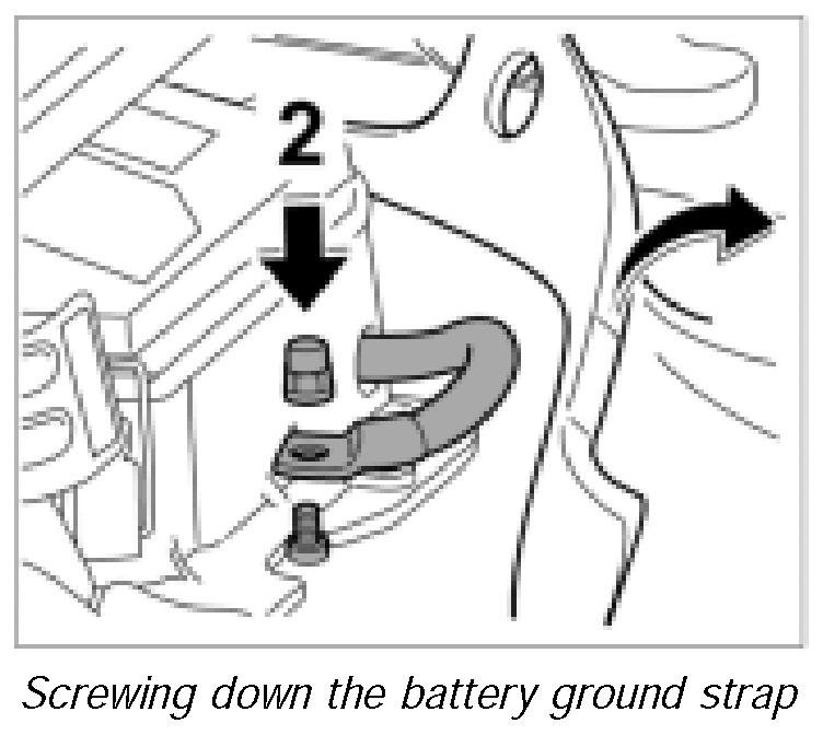 9. Position battery ground strap on the body and screw it on tight with the fastening nut -arrow 2-. Tightening torque 3.5 ftlb.