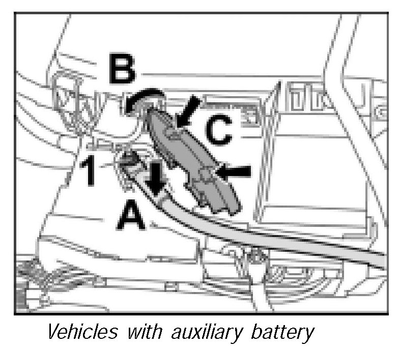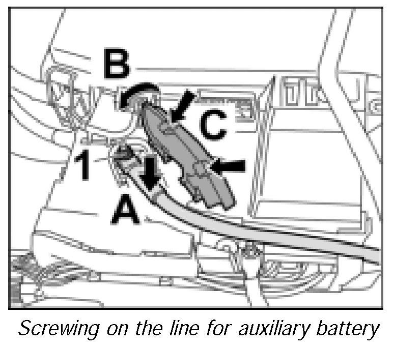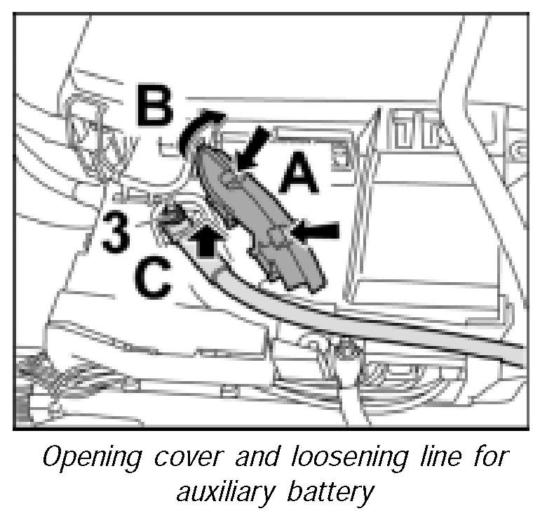 8. Unscrew fastening nut -arrow 3- and take out the line for the auxiliary battery -arrow C-.