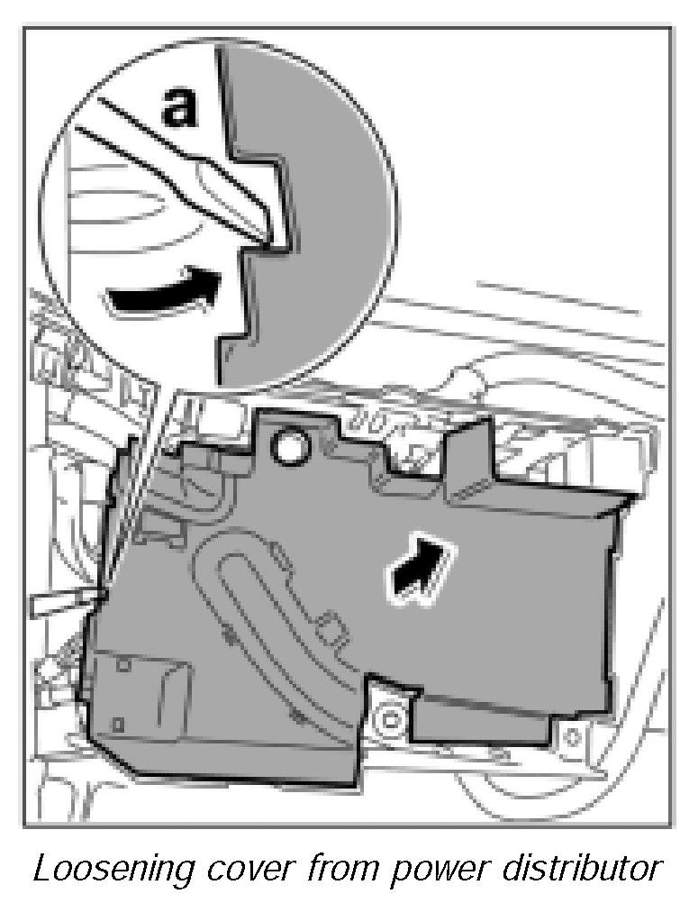 9. Lever off cover from power distributor using a screwdriver -arrow a-.
