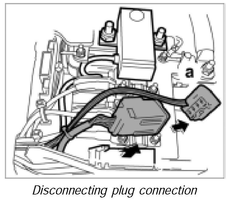 10. Lift electric plug connection for cut-off relay (yellow connector) from the power distributor housing, release -a- and disconnect.