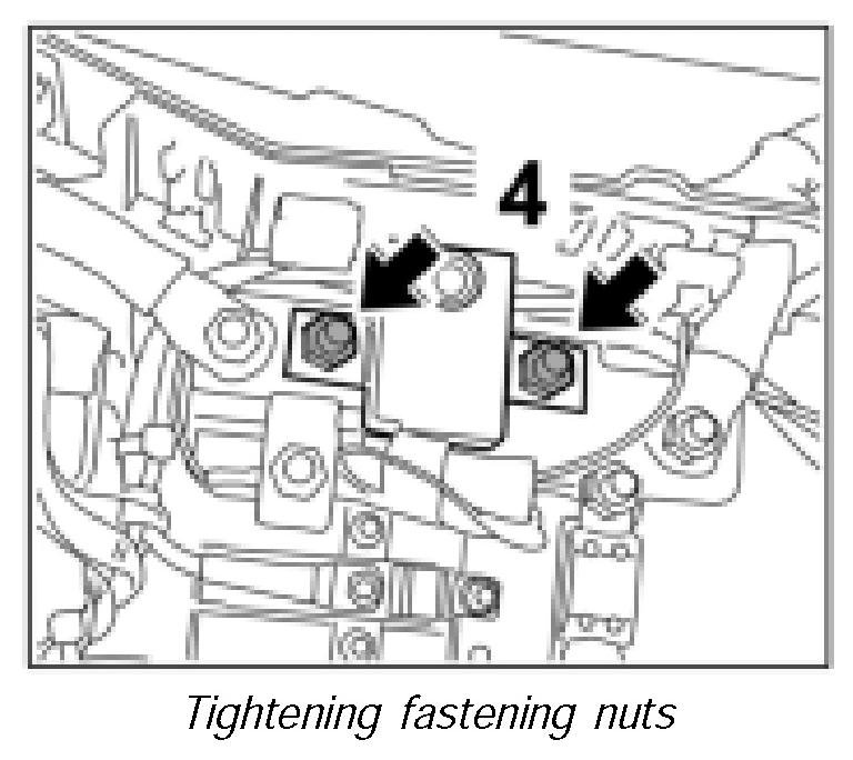 2. Screw both fastening nuts -arrows 4- on the cut-off relay and tighten. Tightening torque 15 ftlb.