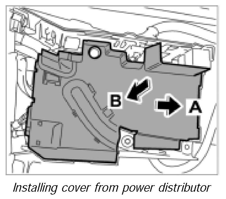 6. Slide cover of power distributor from front to back -arrow A- and press on -arrow B- until latch locks in place.
