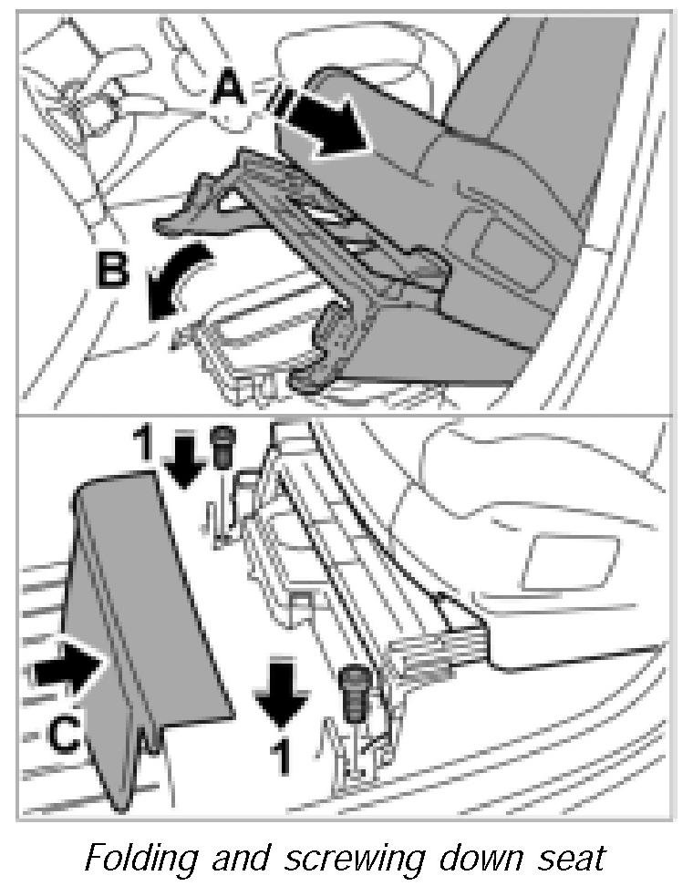 4. Fold the seat back as far as possible -arrow B-. With the seat in its folded position, move the seat forward again using the fore-and-aft adjustment -arrow C-.