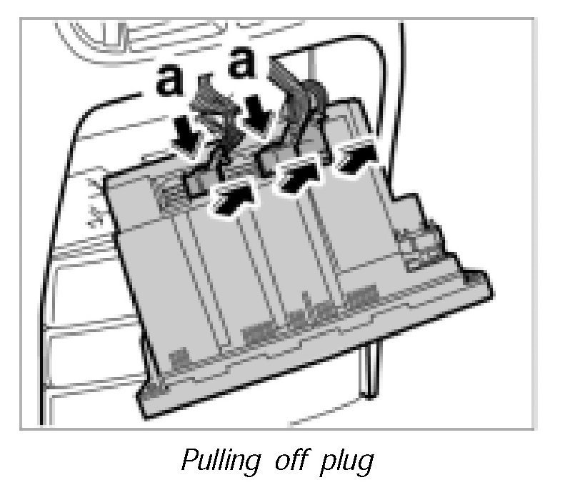 3. Press in latch of electrical plugs -a- and pull the plugs up and off.