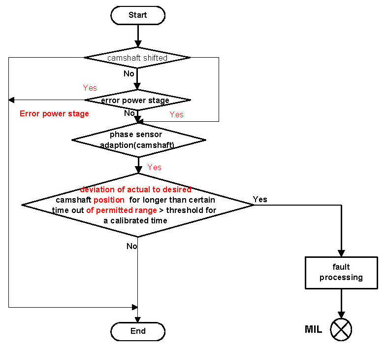 If the actual camshaft angle differs to the desired camshaft position in a characteristic map in a specified range for more than a certain time, a camshaft positioning (plausibility) fault will be stored.