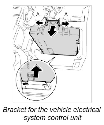 1. Pull apart the locking tabs -A- for the vehicle electrical system control unit, pull the control unit forward and down with connectors still attached then pull it out of its holder at the rear.